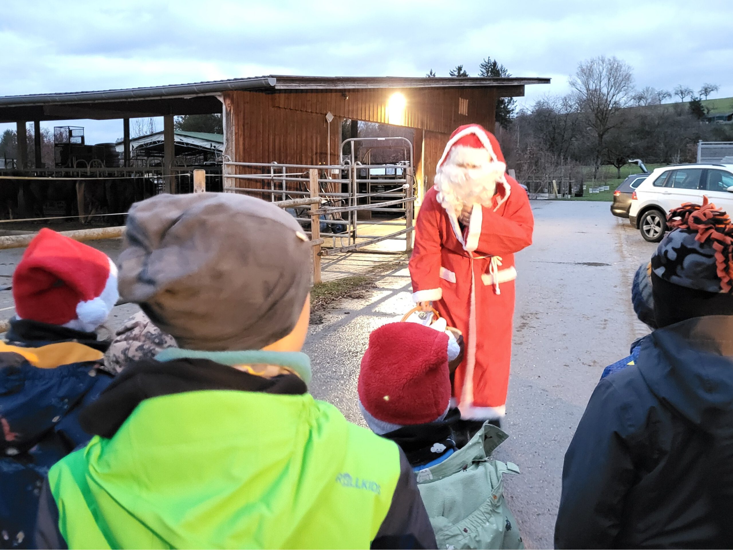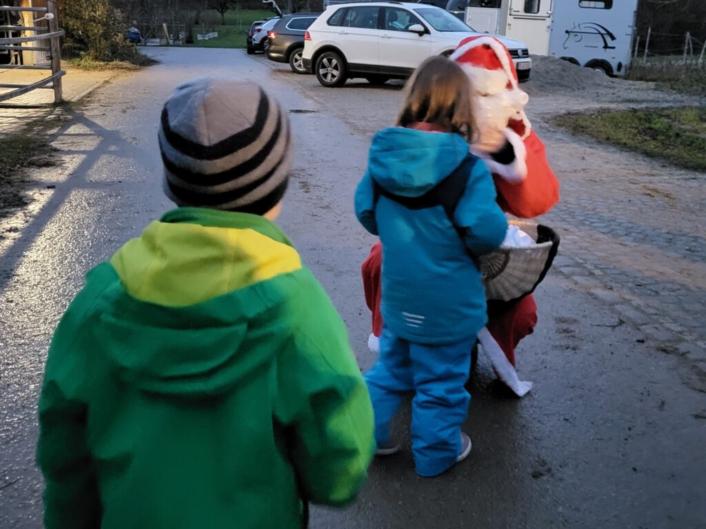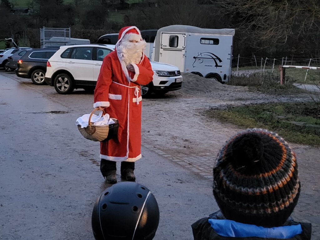 Zurück am Stall war die Aufregung bei unseren Nachwuchsreitern groß: Denn zum Abschluss gab es Besuch vom Nikolaus. Im Gepäck hatte er einen Korb, aus dem er für jedes Kind ein süßes Geschenk hervorzauberte.
